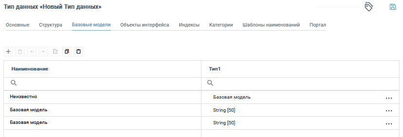 Вкладка Базовые модели предназначена для работы с базовыми моделями типа данных. Вкладка содержит панель функциональных кнопок и таблицу для отображения выбранных базовых моделей. Для успешного сохранения типа данных необходимо наличие в структуре всех полей его базовых моделей.
