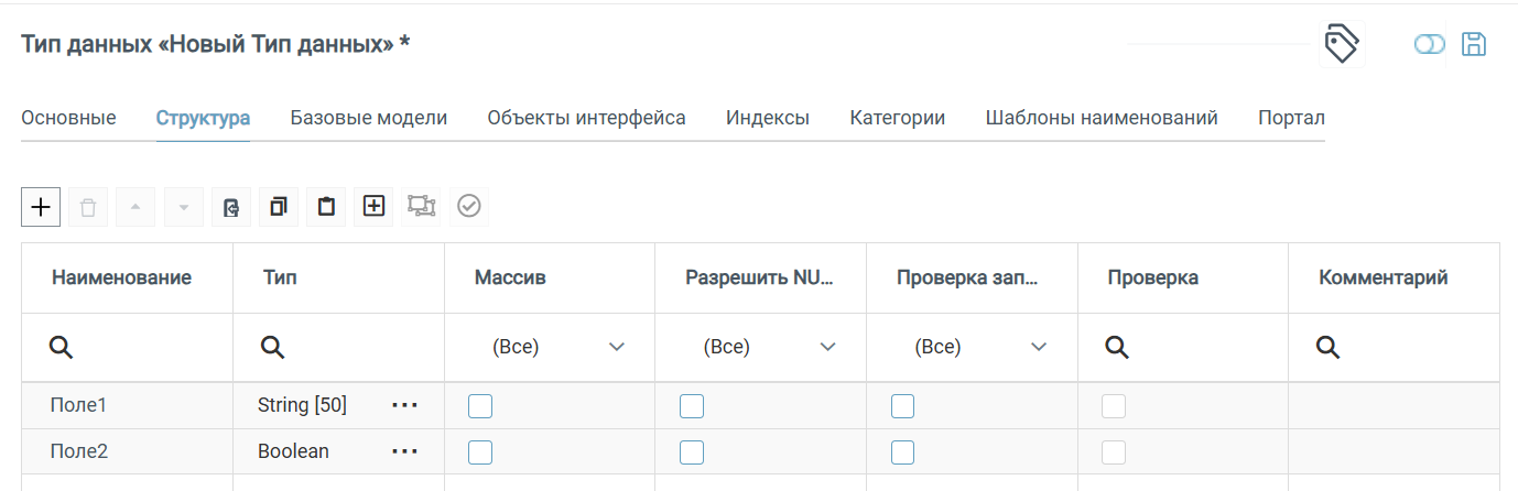 Вкладка Структура предназначена для работы с полями типа данных. Содержит панель функциональных кнопок и таблицу для отображения параметров полей: