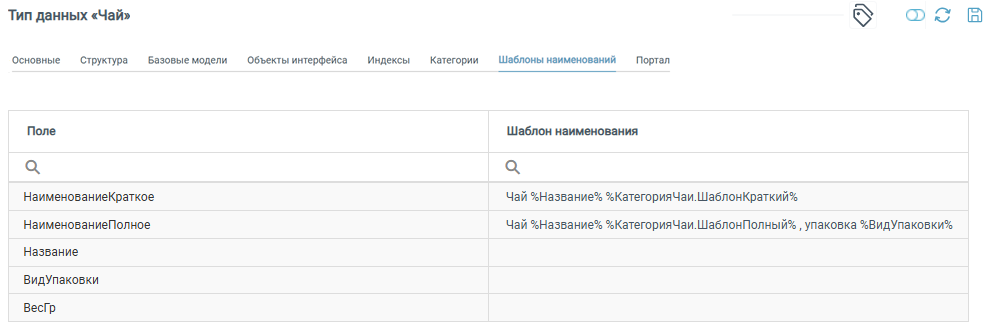 В структуре типа Чай добавлены поля НаименованиеКраткое и НаименованиеПолное, для которых в дальнейшем будут применяться шаблоны наименований. На вкладке Шаблоны наименований типа заполнены шаблоны, в соответствии с которыми будут заполняться значения этих полей.