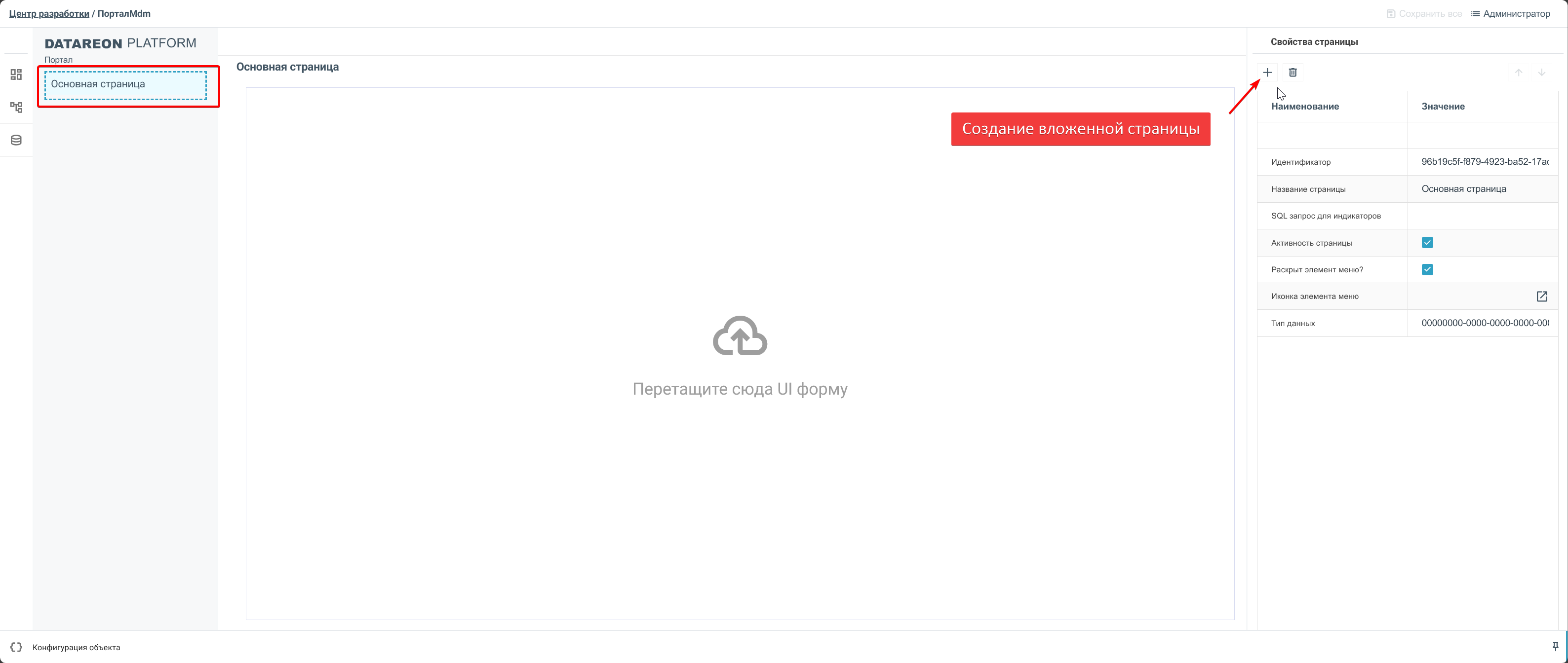 Чтобы создать вложенную страницу, выделите родительскую страницу и нажмите кнопку +.