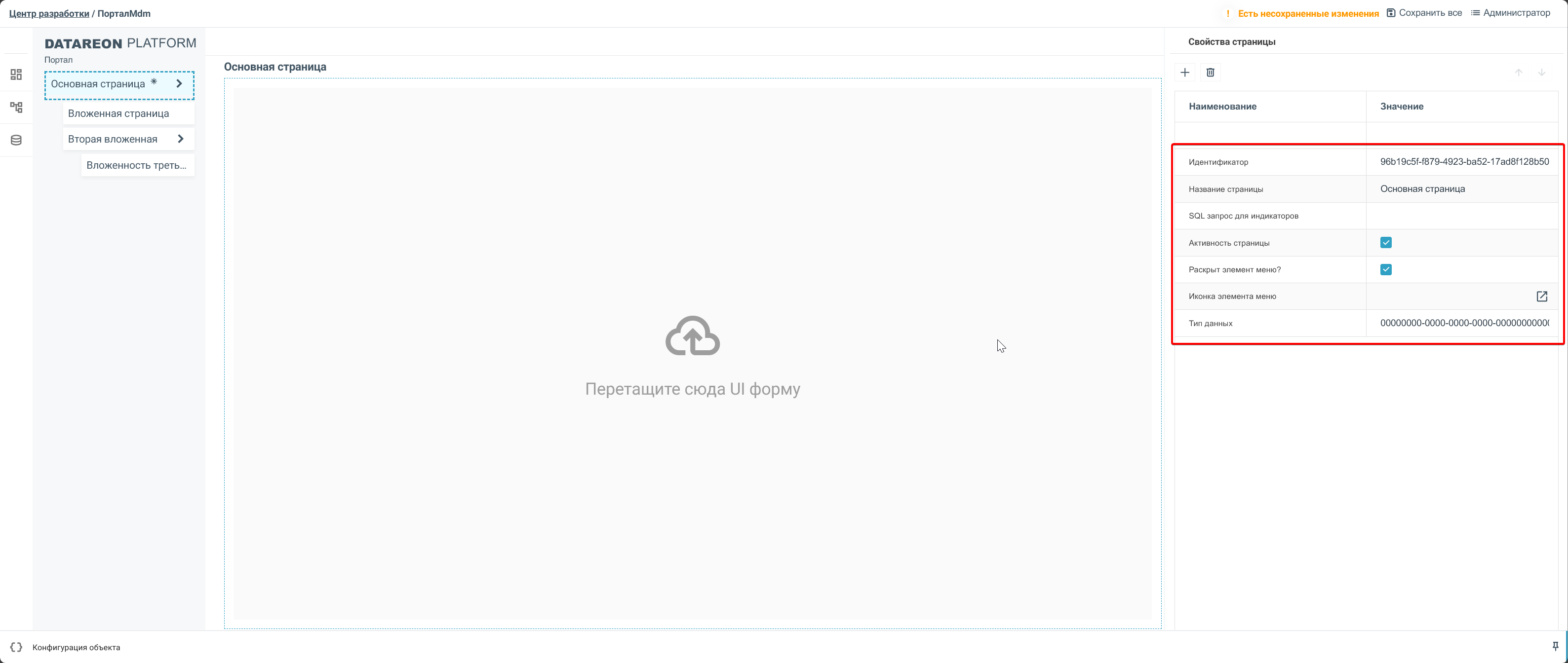 Каждая страница имеет свои свойства, которые можно настроить справа.