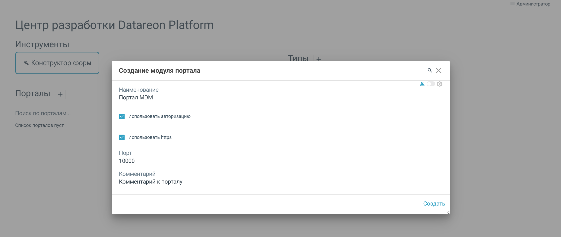 В данном примере демонстрируется процесс создания нового сервиса Портал в Центре разработки Datareon Platform.