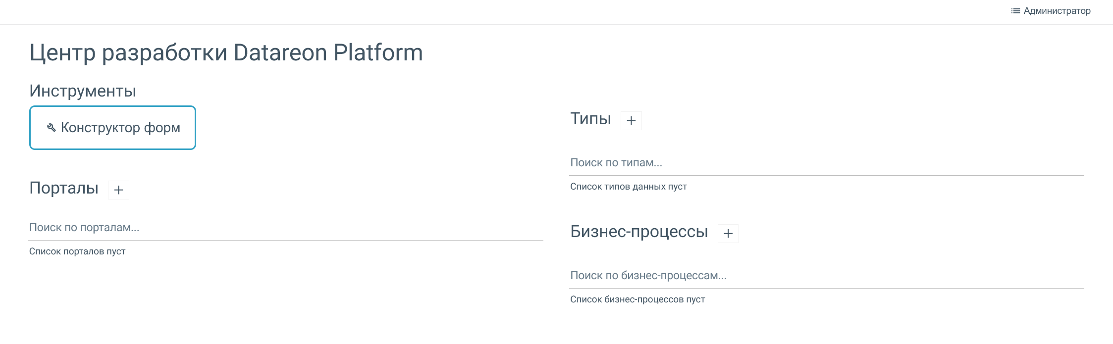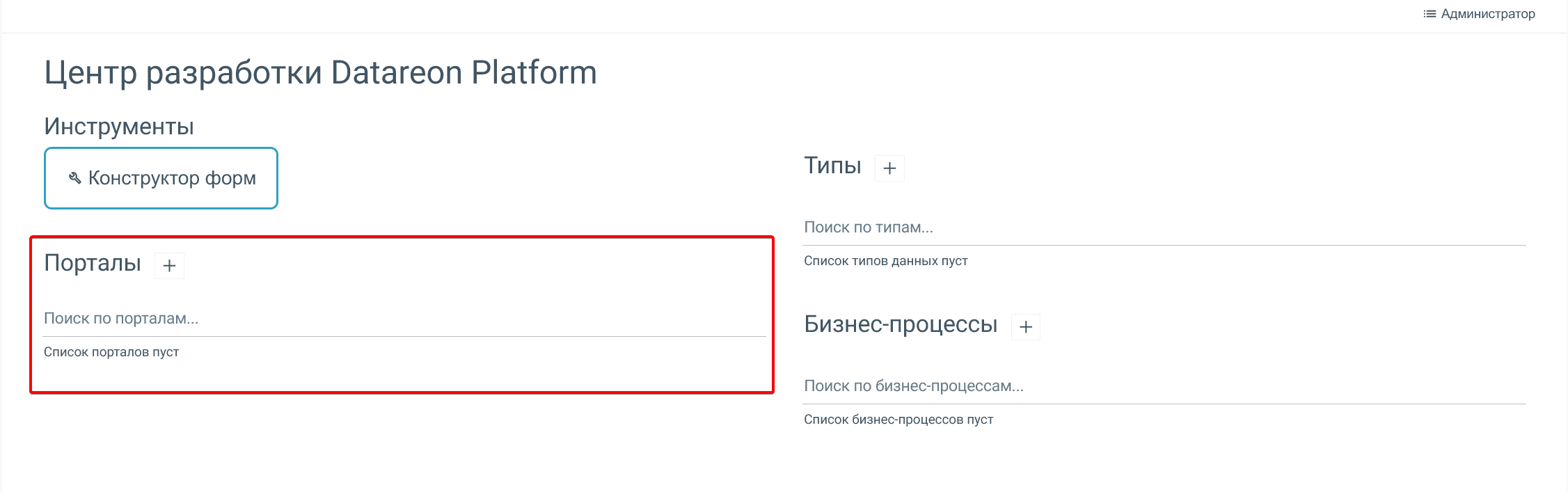 На главной странице Центра разработки представлен раздел «Порталы», в котором отображаются все существующие порталы.