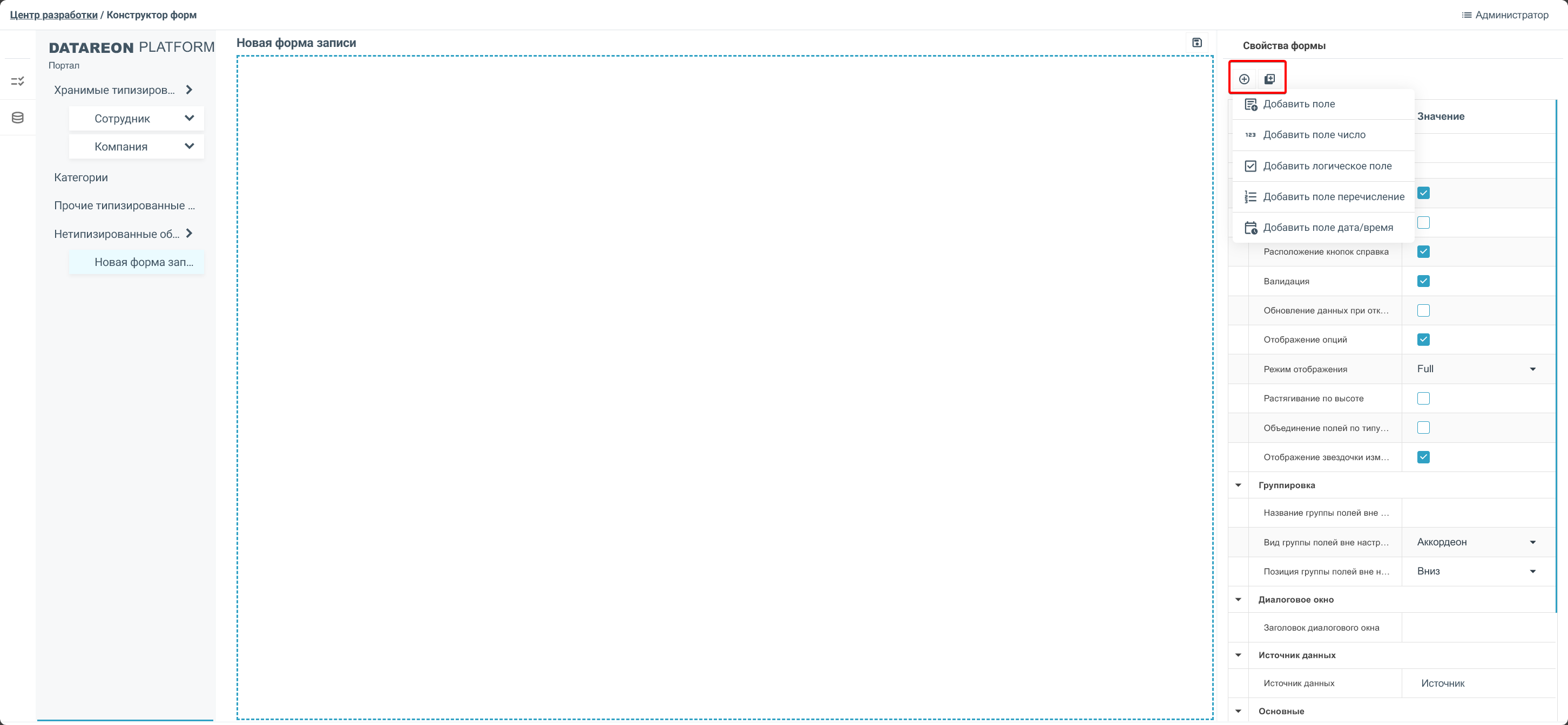 • Чтобы добавить поля или группы на форму, возпользуйтесь кнопками в правом окне свойств.