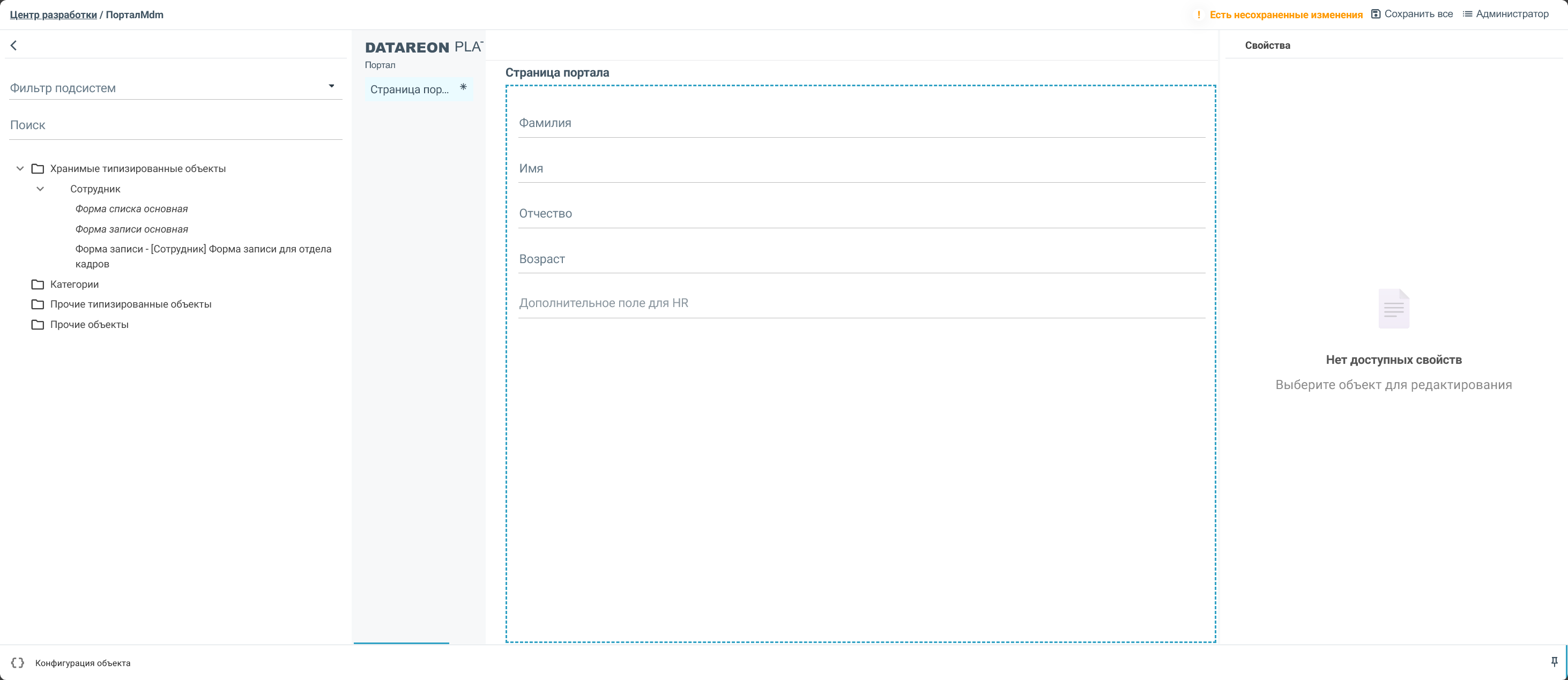 Чтобы отобразить форму на странице портала, перетащите форму на страницу из панели объектов в конструкторе портала.