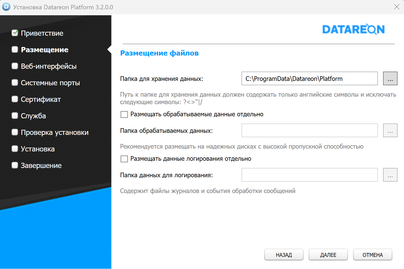 Если вы хотите размещать обрабатываемые данные отдельно, установите флажок Размещать обрабатываемые данные отдельно и выберите папку для обрабатываемых данных.