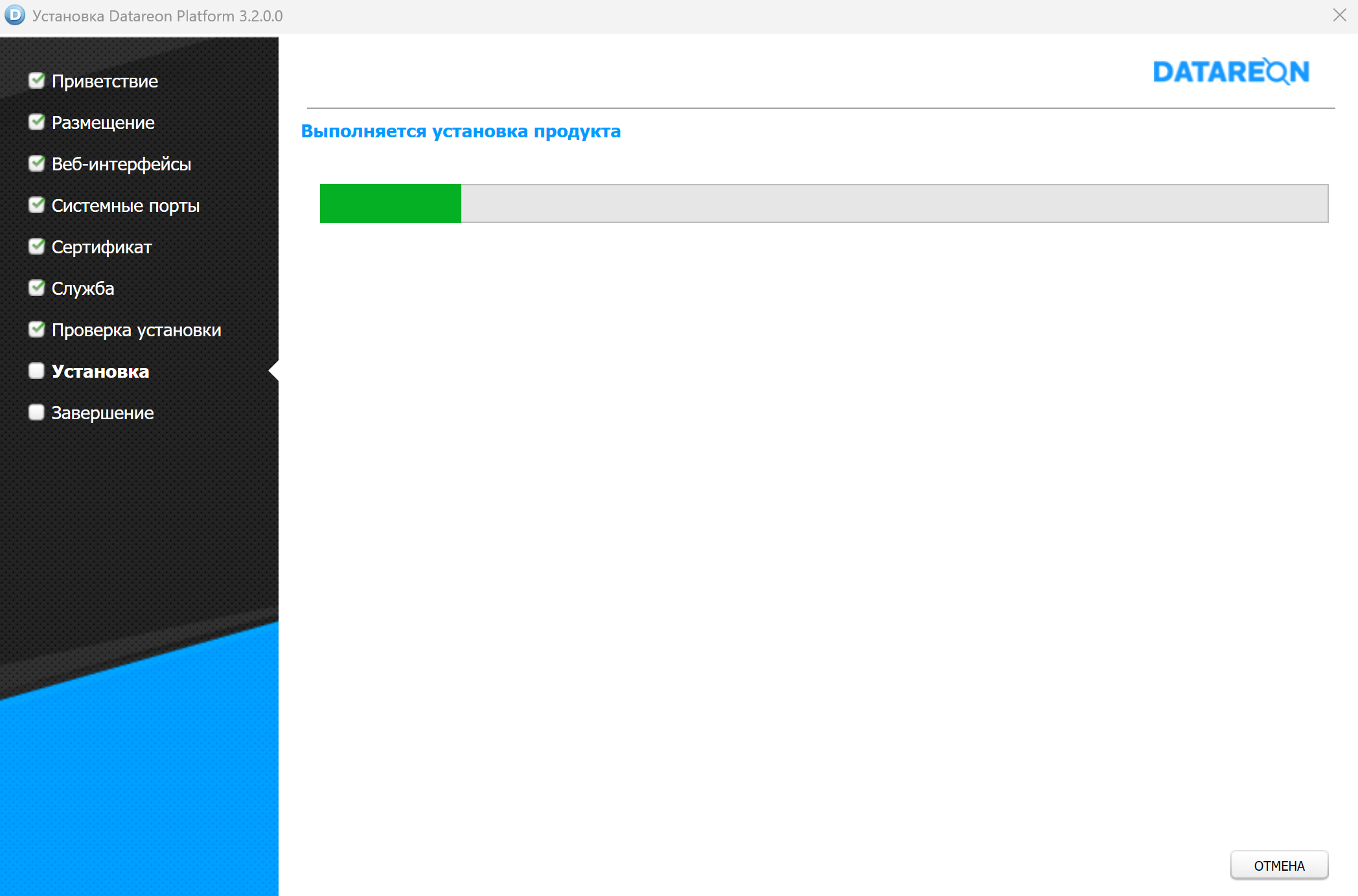 Нажмите на кнопку Установить для перехода к установке Платформы. Откроется окно Выполняется установка продукта мастера установки: