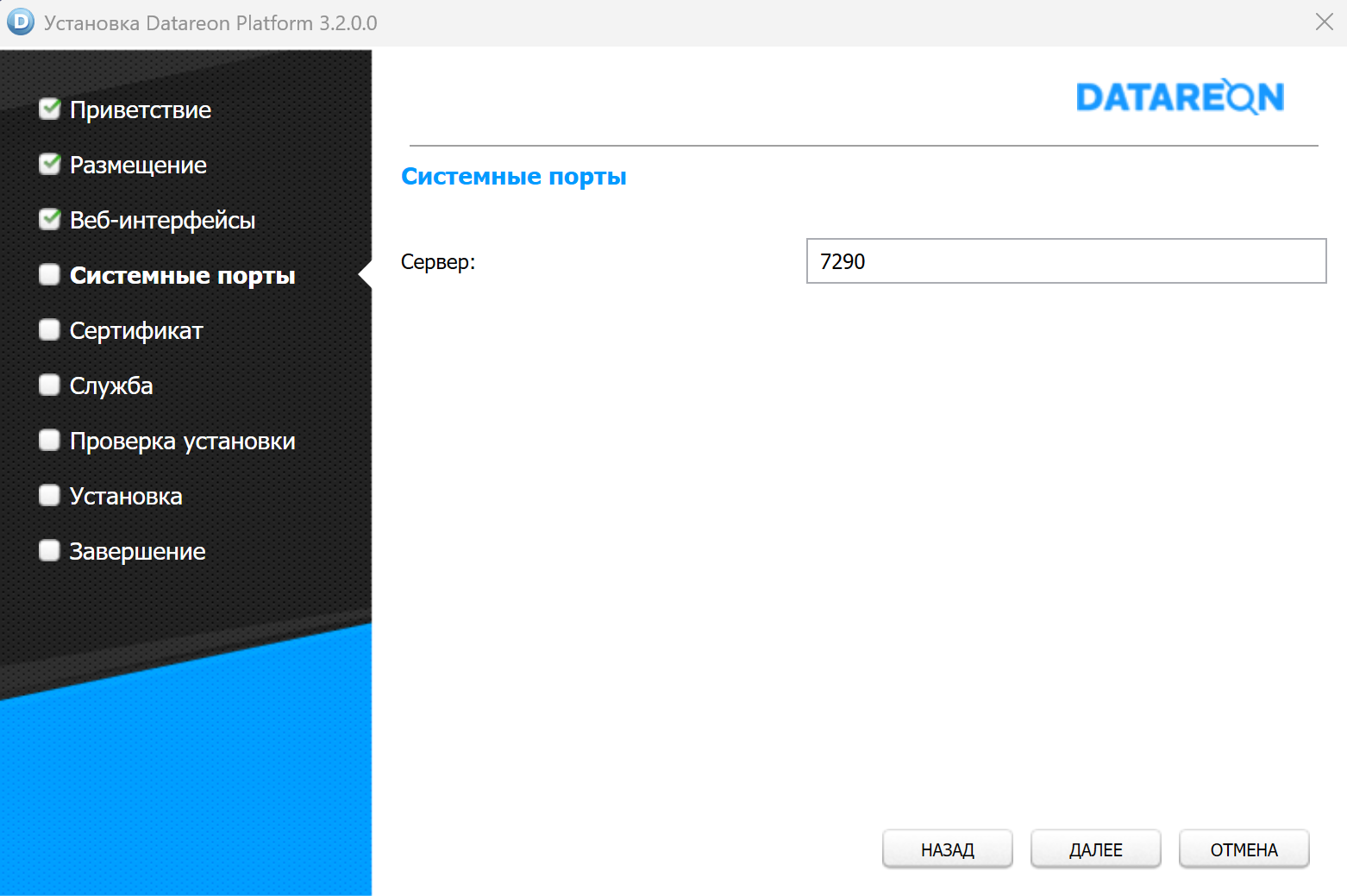 Введите путь к файлу сертификата (например: C:\ProgramData\Datareon\Platform\Datareon.pfx) и нажмите на кнопку Далее.