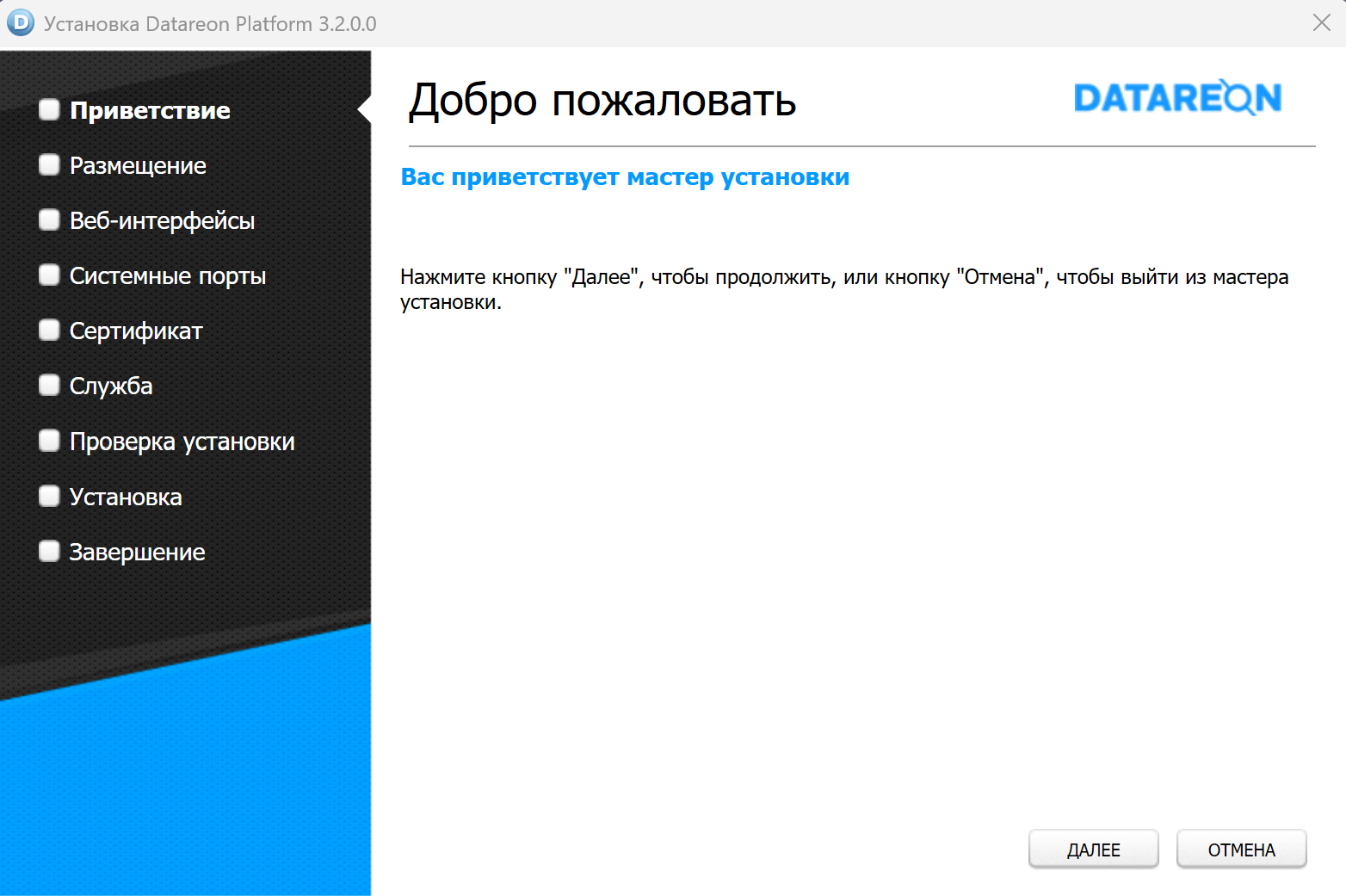 Запустите мастер установки с помощью файла дистрибутива. Откроется окно Приветствие мастера установки: