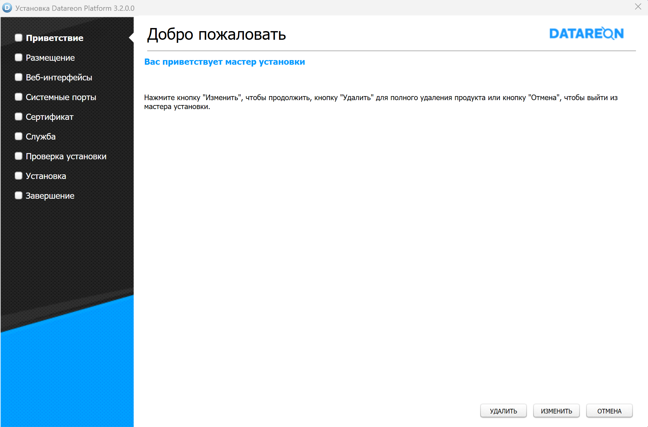 При исправлении установленной версии Платформы с использованием дистрибутива идентичной версии, будет отображено окно мастера, содержащее кнопки Удалить для удаления Платформы и Изменить для запуска процесса исправления: