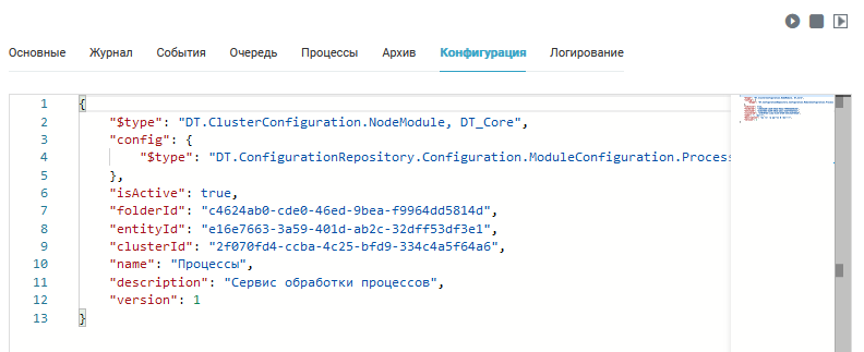 На вкладке Конфигурация отображаются параметры config, установленные для выбранного сервера, сервиса или внешней системы: