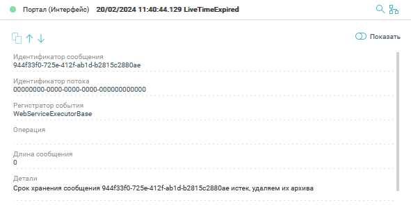 С помощью кнопок управления можно скопировать детализацию или перейти к детализации предыдущего / последующего сообщения, используя стрелки. В правом верхнем углу расположена кнопка Цепочка событий:
