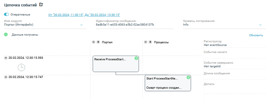 События представляют собой информацию, связанную напрямую с событийными сообщениями. Этапы события отображаются последовательно. В раскрытой вкладке можно выбрать режим Оперативный или Архивный, выбрать Уровень логирования. Выбор значения в поле Имя модуля доступен только в случае открытия Журнала Сервера - фильтрация возможна по серверу или базовым сервисам, в остальных случаях указывается модуль открытого раздела без возможности выбора.