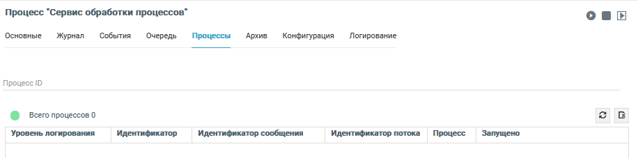 Вкладка Процессы отображается для сервисов, при создании которых был установлен параметр Обработка данных и сообщений.